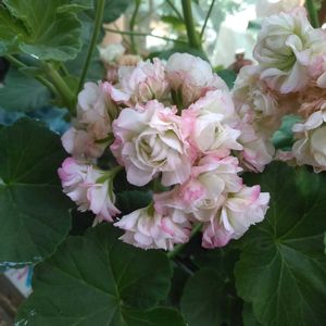 おはようございます。今朝はいい天気。 ・アップルブロッサム ゼラニウム ・グリーンアイス ここからだと横向き😅 ・フローズンクイーン 株分けから増えてきました。 ・まだまだ豪華なクレマチス。何処かに🐸が潜んで鳴いてます。 ・バラ🌹ひと株にピンクぽいのと 下に黄色の蕾!幸せ❤️