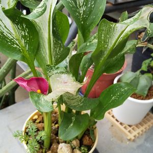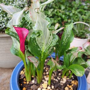 今日の花 カラー フローズンクィーン 昨年のpicです 今は地植えにしてます 先祖返りでほぼ緑っぽい葉っぱになって ますが真ん中辺りからスケスケの葉が 2、3枚でできました🌱