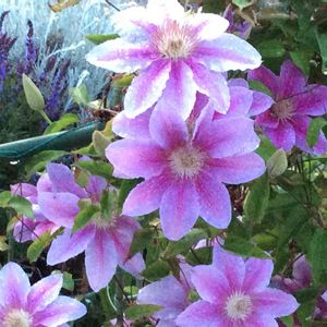 ご近所さんのお庭 なんていう花でしょうか? この咲いた状態のベロベロンとした感じは… こういう花なのか、それとも雨のせいなのか…わかりません😅💦 💜💜💜💜💜 ぬばたまさんから インテグリフォリア系のクレマチスと教えていただきました✨✨ ありがとうございました😊