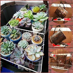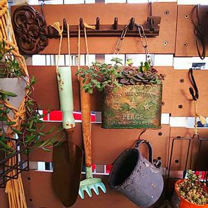 こんばんわ(✿´꒳`)ノ°+.* やっと梅雨明けしたからウッドフェンスの方いじりれる様になったわ!! アンティークショップで購入した鍵のハンキング?(オーナメント名前がわからん)ROOMDECOで購入したシャビーな感じのスコップとクマデ?がまだいい感じの味が出てます♡♡ 自作のリメ缶のハンキングプランターに寄せ植え*° またまた渋い子を植えてリバーシブルで植えてあるよ! 右のヒソン金のリメ缶も自作だよー!