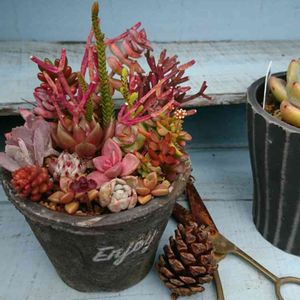 去年 会社の人に 「多肉に使ってね〜♡」 と、言われてもらったシブめの缶 午前中にコーナンで50〜100円の多肉を 補充し、ようやく寄植えすることが出来ました😊🎶 日曜に渋谷蚤の市でお迎えした✨✨ tanitenさんのjunk雑貨と一緒に♥︎︎∗︎*゚