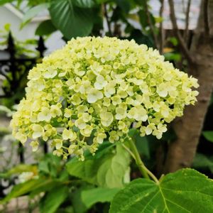 アメリカ紫陽花 アナベルは まだライムグリーンです 先日の強風で蕾をつけた枝かわ数本折れ🥲 葉っぱもズタズタに、、、😭 花数は少ないけれど こうして花開いてくれると 尚更嬉しいです♡