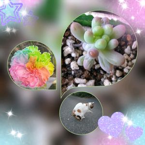 こんばんは🌃 🏷ニャンニャン祭り 🙋参加させて頂きます🐱 1️⃣出かけ先で、レインボーカーネーションを見つけました🌈💠 葉挿しの乙女心、可愛らしい色合いに💓🥰 ご近所さんの猫ちゃん🙀 2️⃣3️⃣🌷アイスチューリップ🌷 撮影2025/1/21🤳