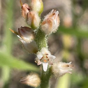 ソクシンラン(束心蘭) キンコウカ科の多年草 本州(関東地方以西)・四国・九州・沖縄・中国・台湾他に分布 やせ山の明るい山道の、ほぼ垂直に近い斜面に生えていました。 名前は、束状になった葉の中心から、花茎が1本出る姿に由来するそうです。 長さ40㎝くらいの花茎に、壺のような形の花を、初夏まで、次々と花を咲かせるようです。 1㎝以下の小さな花が、あちこちの方向に向いて、花茎にたくさん、ついていました。 6枚の花弁の先端は、わずかにピンク色をしています😆 雄しべの葯?が、えんじ色。 全体が白っぽいです。 花や花茎に、毛が密生しているのが、画像を拡大してみて、やっと、見えました