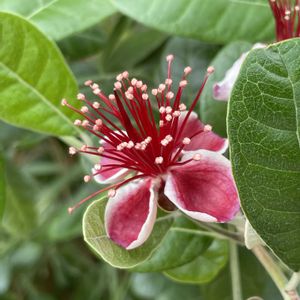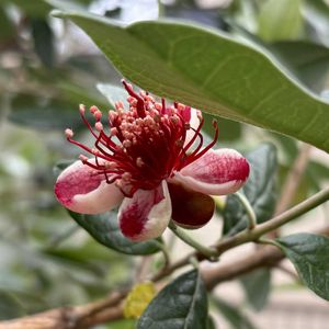 フェイジョアの花 4年目にしてやっと咲きました。 蕾も沢山出てます。 可愛いくて綺麗な花です