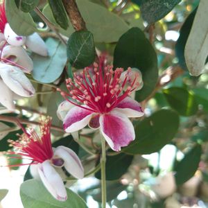 ご近所の庭で、フェイジョアの花が咲いてます あちこち咲いて実もたくさんできるのかな⁉️