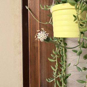 アーモンドネックレス ピーチネックレス 吊り鉢に実家の多肉花壇からカットして来たアーモンドネックレスを植えていましたがスカスカして寂しかったので隙間にピーチネックレスも挿しておいたらモリモリになりました♬
