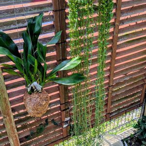 ネックレスの日🏷️ 参加します。 アーモンドネックレスを汚くなったトレリスに吊り下げています。 ここしか下げる場所が無いー。 私の背より高い位置に設置していますが、もう少しで地面に到着します。 横に掛けているのは、みどりのまとめに投稿したグラマトフィラムです。 欄の中では一番大きな欄です。 もじゃマトフィラムにする為に、鉢から抜いて空中栽培をしてましたが、根が乾燥して茶色くなるので水苔を巻きました。 果たしてこの先、白い根は出てくれるでしょうか? 新葉は大きくなっていますが。。。