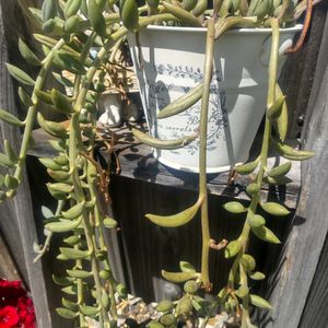 いつもは物干し竿に引っかけてますが、撮影のため多肉ラダーに置いてます 今月のGSの運勢のラッキーアイテムはグリーンネックレス 我が家にはアーモンドネックレスしかなもうないのでこちらを大事に育てたいと思います 結構長く伸びてます 花も一つ咲いてました、蕾もチラホラあります 多肉ラダーもやりかえないと空かすかです