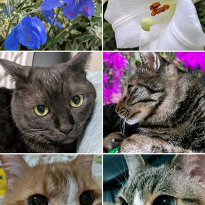 2025.8.22 みちのすけさんの ニャンニャン祭りに参加させて頂きます😽😸🐈🐈⬛💖 1️⃣愛猫全員集合と💙🤍🌿 🌈カルピン♀😽も空〜参加😅 2️⃣チャッピーは最近鼻が汚れている😅 3️⃣ノワールはデブ街道まっしぐら😅 4️⃣グリは最近粗相しなくなった😅 5️⃣3匹と🩷ナツズイセン💜ミソハギ❤️ホウズキ