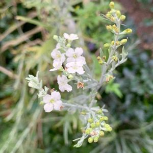 おはようございます 関東地方も梅雨入りしました☂️ ゴンホスティグマ ヴィルガツム シルバーリーフに惹かれて去年お迎えした耐寒性常緑低木 マイナス12度まで耐えるかなり逞しい子らしく、昨シーズンの大雪も難なく乗り越え白い花を咲かせ始めました もさもさと間延びしているので、この子もそろそろ切り戻しかな✂️
