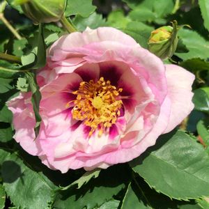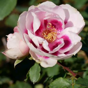 白の花弁の中心に赤紫のブロッチが可愛いバラ「アイズ・フォー・ユー」、イングリッシュガーデンで咲いていました🌹 ①中心が明るい赤紫。 ②開きかけだからか、紫に近いブロッチ。(スライドpic) イギリスのブランド、ワーナー作出。フロリバンダ、丸弁半八重咲きの中輪。 花びらの縁が少し黄緑や黄色がかっています。 ブロッチの部分が目(アイズ)なのでしょう。複色のバラは魅力的ですね💓 イングリッシュガーデンでは、隣に「ブルー・フォー・ユー」が植えてあります。ドキドキしませんか😉 🏷️月曜日にはバラを 雨上がりの我が家の庭にピエール・ドゥ・ロンサールが何輪か。 鉢植えのミニバラは植え替えなければ…😆