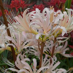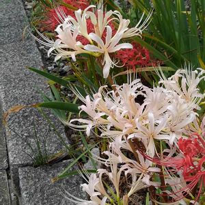 今年知り合いからもらった 彼岸花 台風の中 やっと咲きました モグラよけに 植えたのですが、 そばまで来ている気配が有り、赤の彼岸花は ほとんどでてきません。 庭中歩いているモグラ なんとかしたい。😥