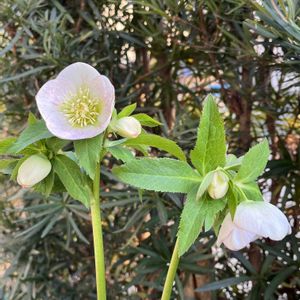 おはようございます( ˶˙ᵕ˙˶ )☔️ 春の陽気から一転して冬に逆戻りですね⛄️❄️体調崩さないように温かくお過ごしください🤗 写真は1番お気に入りのクリスマスローズで、原種のチベタヌス×ボッコネイです🥰素焼きへ鉢増したからなのか…花芽が沢山立ち上がってくれました🥳 まだ1度もタネが取れたことがないんです……難しいのかな?
