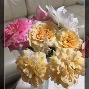 クリーム色のプシュケ🌹♡が 可愛いすぎて もう一回同じようなpicՇ”ਭ·͜·ೢ ⋆ ピンク色はどこかへ 飛んで行ってしまいました🌹♡ 一緒に入っているのは モネさんとガブリエルです。 うしろにリュート🌹♡ 本来柔らかなアプリコットピンクの花は、 ロゼット咲きになり、 アンティークな雰囲気です。 ティーベースの独特な透明感のある香り。 作出者の木村卓功氏は 「同じような花型を見せない自由気ままさがあるバラ。 …春は波状弁がかったロゼット咲き。 …真夏はなぜか花弁数が増えてボタンアイのロゼット咲き。 晩秋や初冬はカップ咲き。 …香りはティーベース。 青リンゴの香りがうっすら漂う透明感 があり、個人的には天上界の香り。 …何もしなくても、葉を落としても 新芽を展開し育ち続ける丈夫なバラ」 と語っているそうです.•*¨*•.¸¸♬ 前回のpicを見ると (7月7日のpicですよかったら比べてみてね) ほんとに 自由気ままなのがわかります 前回のpicではしっかりと アプリコットピンクのお花でした 別人のようです(*´艸`)ウフフ🌹♡