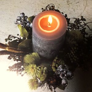 キャンドルと🕯𓈒 𓏸𓈒𓂂𓂃◌ ドライフラワーでしっとりと ユーカリテトラゴナ、へクソカズラ、フィリカ、ベルベットビーンズ、リモニウムなど。