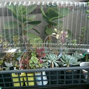 、、、ヒロシです💧。 多肉が育ち過ぎて、カバーが閉まらんとです💦 どーしよぉ❗❗只今冬の準備してました。 去年ここでカバー付けて越冬したから、今年もそのつもりでカバー掛けたら、ガーン( ̄▽ ̄;)⤵し、閉まらない💦💦 なんぢゃい❗成長しとるやないかーい(笑)❗ 困ったなー困った❗あの名無しのデカイ子が縮めばって無理だし。切るのも時期的に無理だし。 どぉする‼? あのデカイ子,一体誰〰(笑)💦