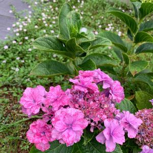 雨に濡れる紫陽花〝おはよう”と、奥に見えてるヒメイワダレソウ。 可愛くて癒される😊✨✨✨ 紫陽花の方、写真に映ってるのはピンクだけど今咲き始めてるやつはちょっと紫がかってる。買った時のタグは青だった。 土はピートモスを加えて植え付けたはず… 何もしなければ、日本は酸性に寄ってくるって言いますよね🤔 混乱してきた😣💦 あなたはピンクの子なの?水色の子なの?どっちでも無くて、どっちにでもなれる子なの? そもそも、紫陽花の色って品種で決まってるってことではないのかな???🤫🤫🤫 わからない… 綺麗な発色を目指してるだけで、どちらでも良いんだけど😀 咲きたい色で咲けばいっか。😌😌 一度、色の調整はやめて、自然に任せようと思う😌🌟 どんな色でも、紫陽花は好きです💕