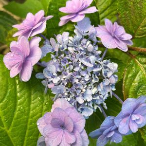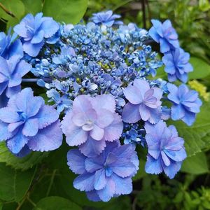 🍃おはよう🍃 今日は雨も止んで しっとりした空気が気持ちの良い 朝でした。 でこの花 💠おはよう です。 ガクアジサイのおはようという品種 今年の春、DIYのお店で398円 小さな苗だし 今年は咲かない… と思ってたら あれよあれよとちっちゃい蕾が デデーン でした。 最近のアジサイの花の大きいこと❗️ 微妙な色合いが 私のこころをくすぐります❣️💦d