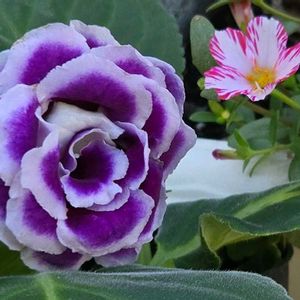 こんばんは~😃🌃 💜🤍八重咲きグロキシニア🤍💜 和名 オオイワギリソウ(大岩桐草) ツートンカラーで八重は豪華❇️ 多年草ですが、 冬越え出来るかなぁ…🤔 ➀②はポーチュラカとハイビスカスとのコラボ~♪