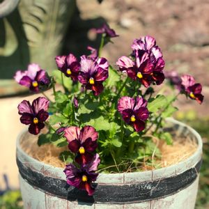 昨年末に植え付けたビオラヌーベルヴァーグ🌺 元々複雑なカラーをした子でしたが、黄色が出てきたかな、ボジョレーさんと似た雰囲気のヌー様です