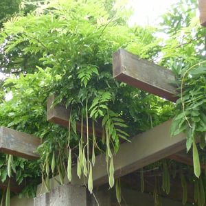 藤棚にたくさん実ができていました。 藤棚の下は憩いの場です。 ベンチで一休み!