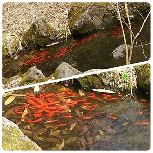 近くの森林公園ぽい所に 散策に行きびっくり❗ 池の一隅がオレンジ色になってる❗ 近づいて見たら金魚がひしめいてた 共に越冬した連帯感なのか移動するときも みんな一緒でした🎵