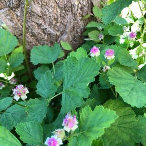 苗代苺(ナワシロイチゴ)のお花🌸 バラ科の落葉低木で高さ30cmほど、ややつる性で這うようにしているので草のように見えます。茎には下向きのトゲがあります☘️ 花は初夏に咲き、枝先で花茎を分けて数個の花をつけます。花は径1cm前後の紅紫色の5弁花ですが、反り返ったガク片の中心に円錐形になっていて、花弁は開かないのが特徴です🌸 果実は夏に熟し、紅赤色の径1.5cm前後の球形で、つぶつぶになっています🍓 葉の縁には粗い鋸歯(葉の縁のギザギザ)があります。葉裏が白っぽいのも特徴です🌿 筑波山⛰で見つけました💕