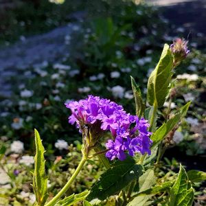 厚さに負けず コンクリートの隙間から 三尺バーベナが笑顔です。 (背丈は7~8㌢。 ほんとは、3尺だから90㌢程になる、以前植えてた零れ種より) (〇'д')bファイトです!! 💜⋆͛ 奥は、イワダレソウ