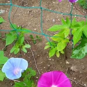 お~い、後ろにネットがあるよ💗🌿💗🌿 こぼれ種の朝顔がネットにからまず咲いています😅