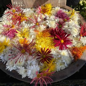 深大寺の花手水です。 神代植物公園で育てていた菊花の花が水面を飾る。