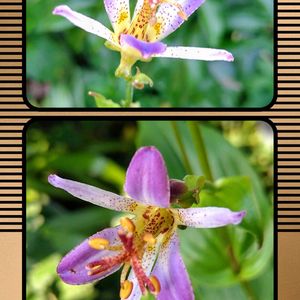 ① ホトトギス🌿 1番に咲き始めたのは、タイワンホトトギス系の[秋空]🎶 名前の通り、秋空を思わせる色合いが美しいです✨🩷💙💜✨ ② ホトトギスの隣では、4月に咲いた山芍薬の花後の鞘が裂けて、赤と黒の実が顔を出しています❤️🖤 AIによると赤い実は結実しておらず、結実した黒い実を蒔くと2〜3年かかりますが、芽が出るそうです🤗 昨年蒔いてみたので、早ければ来年出てくれるでしょうか🙏🌱