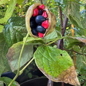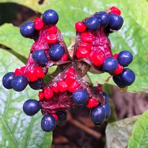 今日2枚目は初めて出会えた ①鮮やかなヤマシャクヤクの実 ②ザクロのように中の種子が 弾けた様子🔴🌑🔴 この種子は完熟のものは黒🌑 で赤いのは不稔の物🔴色とりどりで美しく花と共に茶花としても愛されているそう💡 ③かなりの群生🌿🌑🔴🟢🌿 🏷自生 🏷赤い実 🏷山野草マニア 檜原村で🏕️2025.8.29