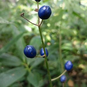 ①青いキレイな実を見つけました✨🔵下を見ると見覚えのある葉が、、、🌿 ②春に咲いていたツバメオモト🤍🌿 ③④ちょっとこの実にはビックリ! こちらは花から想像できませんがヤマシャクヤクの実です💙💕 ⑤春に咲いていたヤマシャクヤク🤍🌿 入笠山にて…その③
