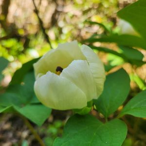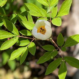 ヤマシャクヤク(ボタン科) 4/10 蜂🐝さんお仕事中❣️ この日 牡丹も熊谷草もまだ開花していませんでした 山芍薬が咲いていてくれて嬉しかった〜〜💕 気品のあるお花ですねー この花を見ると去年一緒に山歩きをした時 急斜面下にこの花を見つけ木や枝に捕まりながら 写真を撮りに行ったド根性花活に感心した事を思い出します