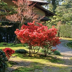 ①②梅林の梅花碇草が消えた😭と嘆いていたら、兼六園研究会のメンバーが利休梅の近くにあるよと教えてもらい見つける事ができました。 機会を見てみどりのまとめの『兼六園梅林』のマップを直そうと思います💕 ③④利休梅が満開です。後ろの春紅葉との対比が綺麗です。