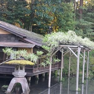 兼六園開園記念日に 霞が池に浮かぶ内橋亭でこの日だけ開放してお茶会があると聞き飲みに行きました。水面がゆらゆら天井に映っていました。池に緑が映り込んで晴天で良かったです。 いつもは4つのツツジ越しに内橋亭を見ていましたが、今日は反対です💕 ⑤橋は太鼓橋で小舟が停めてありました。 目に青葉~2025の風景とします。