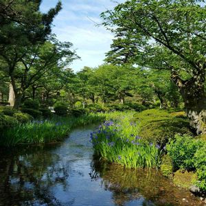 今日の兼六園 根上松のまわりの曲水の杜若はまだですが、梅林へ下りた曲水の杜若は咲き始めました。 目に青葉~2025の風景として見てください。