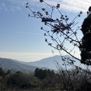 ジュウガツザクラ越しに筑波山 手水舎にはモミジ、サザンカ、つまみ細工の簪と😍 放し飼いの孔雀が階段を降りる姿を初めてみる 人馴れしているので私の横を通り抜け更に階段を降りる! 雨引観音にて(あまびき)