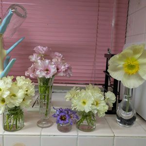 カットした花は、キッチンに飾ります。ラックスアリアドネ、グレーシス 茎が細長くて花首が折れてしまった、リューココリーネ 間違えてカットしたポピー
