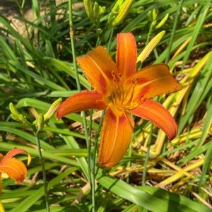 6月4日撮影 東京都薬用植物園 ノカンゾウかと思いましたが シナカンゾウとの札が立っていました。 ノカンゾウよりも少しだけ色が赤く濃いような感じです。 シナカンゾウ(支那萱草) ツルボラン科ワスレグサ属 【別名】ホンカンゾウ 【植栽区画】有用樹木区樹下(ロックガーデン隣) 中国原産の多年草です。日本の原野に咲くノカンゾウの基準変種にあたり、見た目はそっくりです。ノカンゾウのほうが花冠の基部の筒状部が長いことから、変種のレベルで分けられています。 花は大型で豪華ですが一日花で、毎日新しい花へと交代しています。つぼみや花は食用となり、中華食材の乾物「金針菜」は、本種のつぼみを乾燥したものです。 本種の仲間(キスゲ属 Hemerocallis)は山地草原に咲くキスゲ(ユウスゲ)やゼンテイカ(ニッコウキスゲ)、日本海に浮かぶ飛島と佐渡島に産するトビシマカンゾウ、また東京多摩地域の限られた丘陵に咲くムサシノキスゲなど、多くの種や変種が存在し、これらを基に園芸花卉のヘメロカリス(デーリリー)も作出されて親しまれています。 いっぽうで分類上の位置づけは定まらず、新エングラー体系ではユリ科とされたものが、その後提唱されたAPG分類体系では版が変わるごとにワスレグサ科、ススキノキ科と変遷し、現在最新のAPG IV版ではツルボラン科に属しています。 ツルボラン科とは聞き慣れない科名ですが、アロエの仲間が同じようにユリ科から変遷を経てツルボラン科に属しており、両者が近縁であることを示唆しています。 なお、読みが同じであるため時に混同されますが、本種の仲間のカンゾウは「萱草」と表記され、漢方処方の重要生薬であるカンゾウ(甘草、マメ科)とはまったく異なる植物です。 【別名】ホンカンゾウ (東京都薬用植物園 季節の花 より)