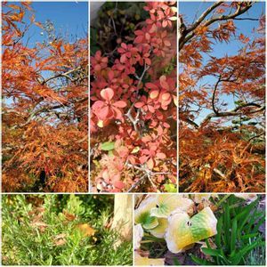 こんばんわ。 我が家の紅葉です。 真ん中はメギの紅葉です。 右↘️ギボシ 左↙️ローズマリーの上に🍂取り除く時いい香り