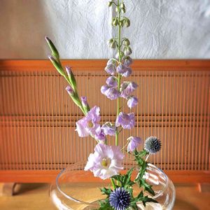 庭のお花 デルフィニウム、グラジオラス、 ルリタマアザミ 今日みたいな暑い日は クリアなガラスの花器が いい仕事してくれますね٭•。❁。.*・゚ .゚・*.❁。.*・٭•。