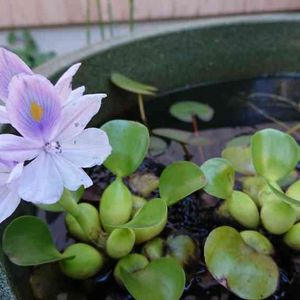 庭のビオトープに浮かべたホテイアオイが花をつけました。 なかなか素敵なお花です(^o^)