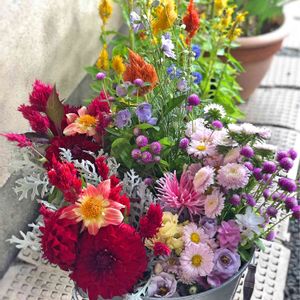 お彼岸ですね 庭の花をほぼほぼカット❁¨̮ 仏花用に束ねました。 ナンチャッテ花屋さん😊