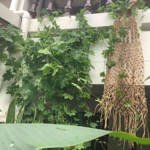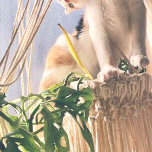 ゴーヤ🥒伸び伸び成長してくれて未だ伸びそうだったので、マクラメを編んで見ました。 誘導して見たけど、上手くツタってくれると良いな┬|ョ゚д゚*)