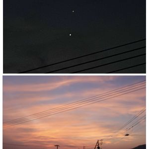 阿波踊り 熱気鎮まる 明け方の 空に輝く 木・金星 写真上半分は、接近中の木星(上)と金星(下)です。 徳島は雨など気にせず阿波踊りで大賑わい。一方夜空は、お盆の期間中、ペルセウス座流星群の極大、木星と金星の大接近など厳かな天体ショーが控えていましたが、どちらも雨で見られませんでした。 けれど、今朝3時過ぎから明け方にかけて、雲の隙間に接近中の木星・金星を見ることができました・・ヤレヤレ。今日も暑くなりそうだけど、頑張ります😅 植物無しですが、投稿させてくださいね🙇♀️