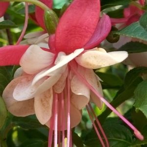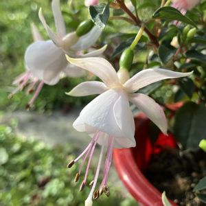フクシャ(エンジェルス イヤリング) アカバナ科 低木 原産地 中南米 西インド諸島 ニュージーランド 下向きに咲き、雄しべより長く突き出てる1本の雌しべ…❣️ その容姿から 貴婦人のイヤリング と呼ばれるています。かわいい花ですね。🌸 挿し木も簡単で増やせます。🌱🌱 picも挿し木したものです。🤗 寒さにはやや弱いです。 ウッカリ水切れに⚠️ですね。🤭 葉がチリチリ…直ぐに🚰かければ大丈夫ですよ。👌