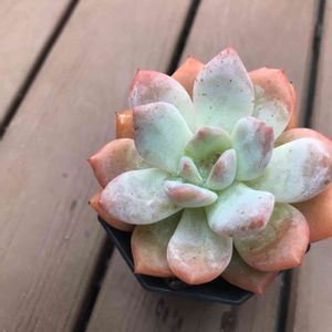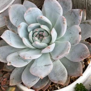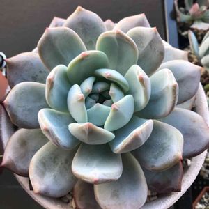 ぐんぐんと成長するラウリンゼさん💓 お粉白肌がたまりません😄 葉にも厚みがでてほんのりピンクに色付いてきました💓 もう鉢にぱつぱつ😅 植え替えしなきゃだけど、指のカタを付けずに植え替える自信がありませーん😅