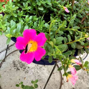 🌱ポーチュラカ☀️本日35℃予報☀️ 美味しいかい? お昼に仕事から帰るとあらお客様🦋 慌てて撮影したものだからアングルも何も無い😱 花がらさんも台風後の地面も映っちゃった🥺 あはは